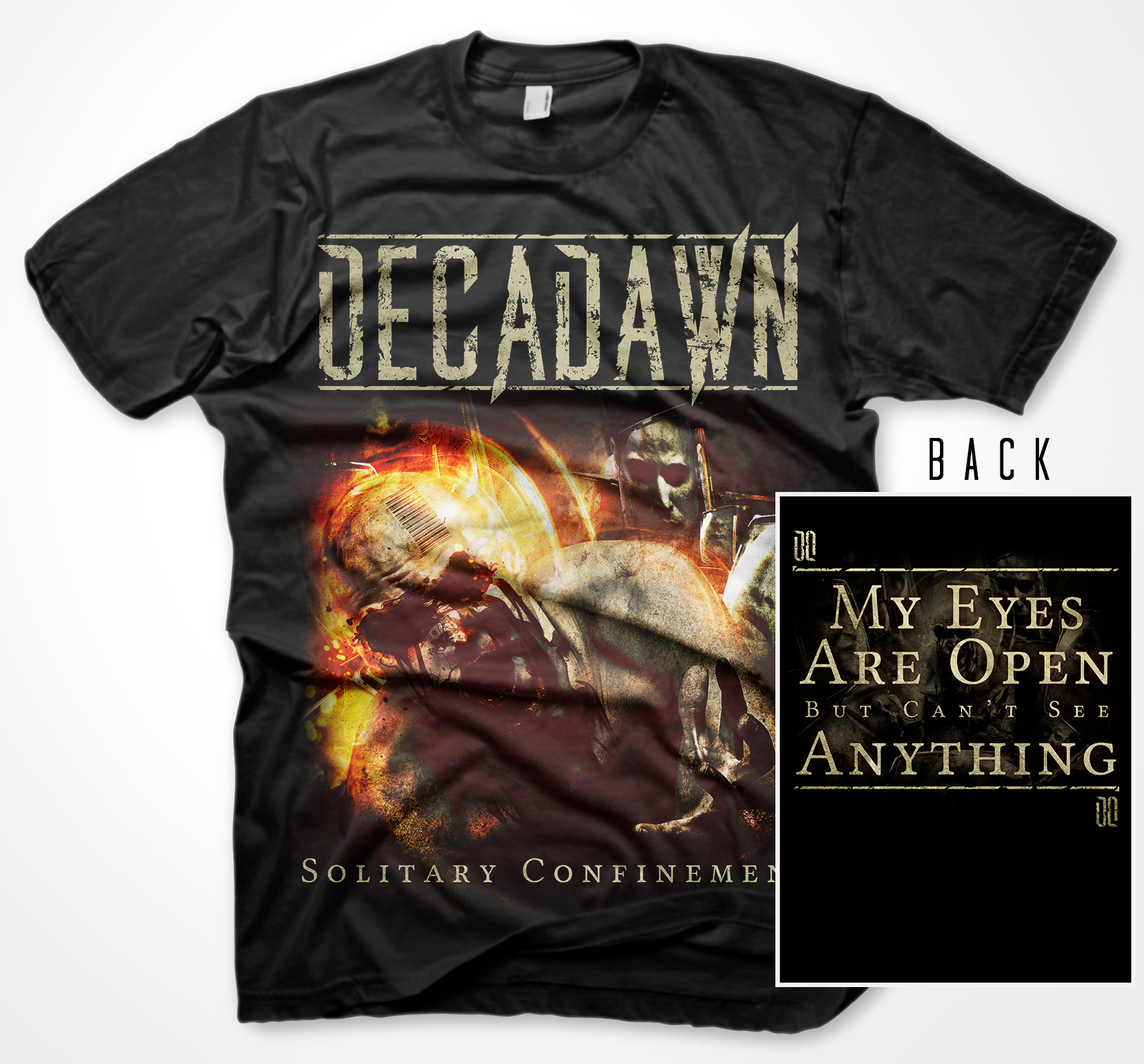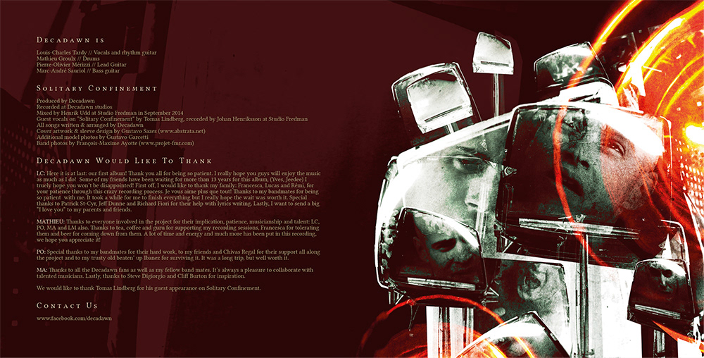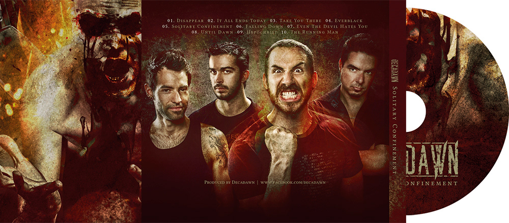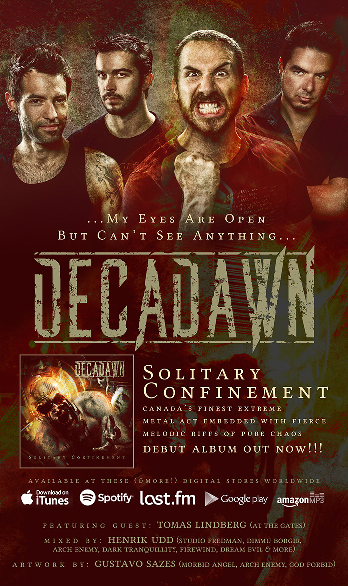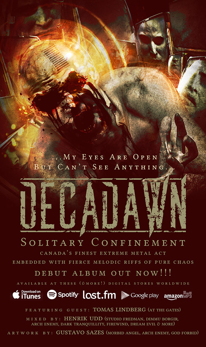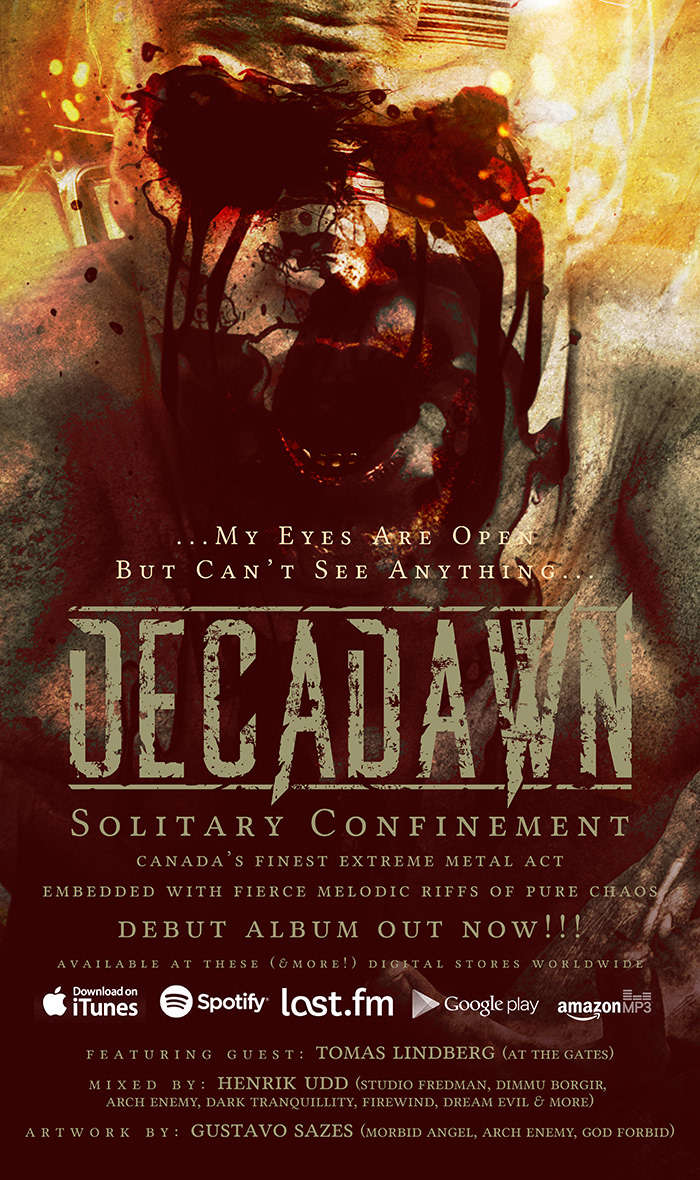Here is the artwork, merch, digital single and layouts I did for extreme metallers DECADAWN (Canada) album "Solitary Confinement"